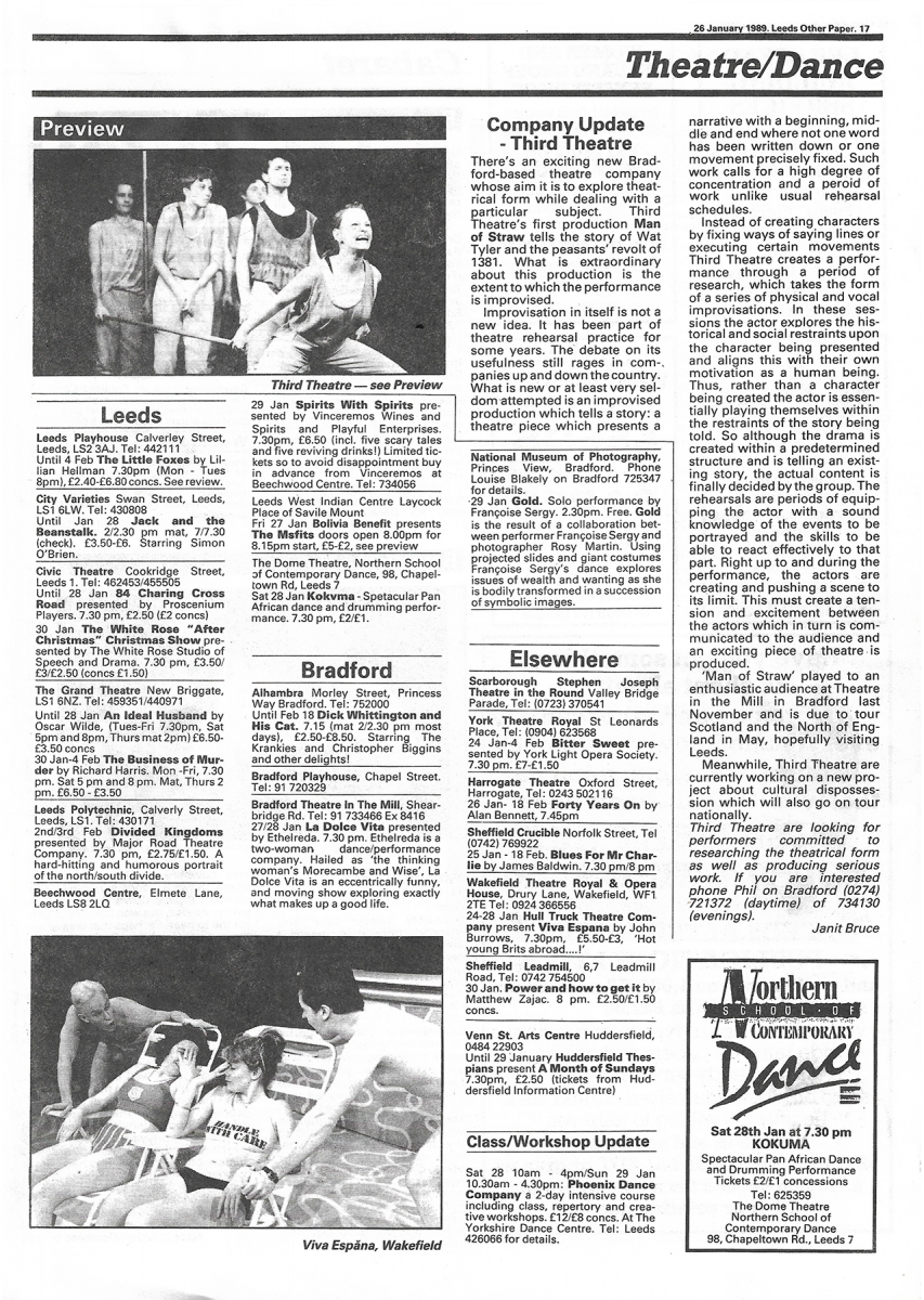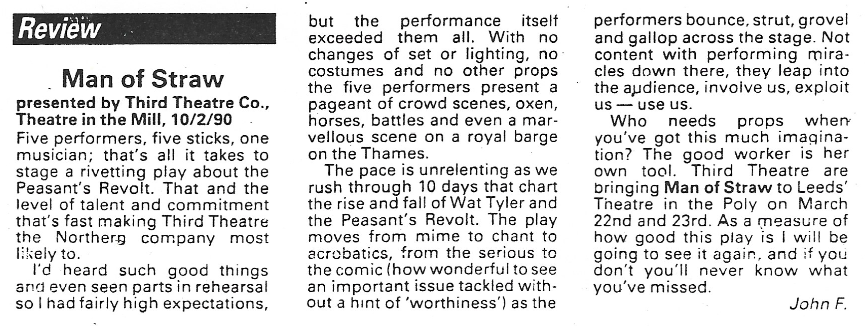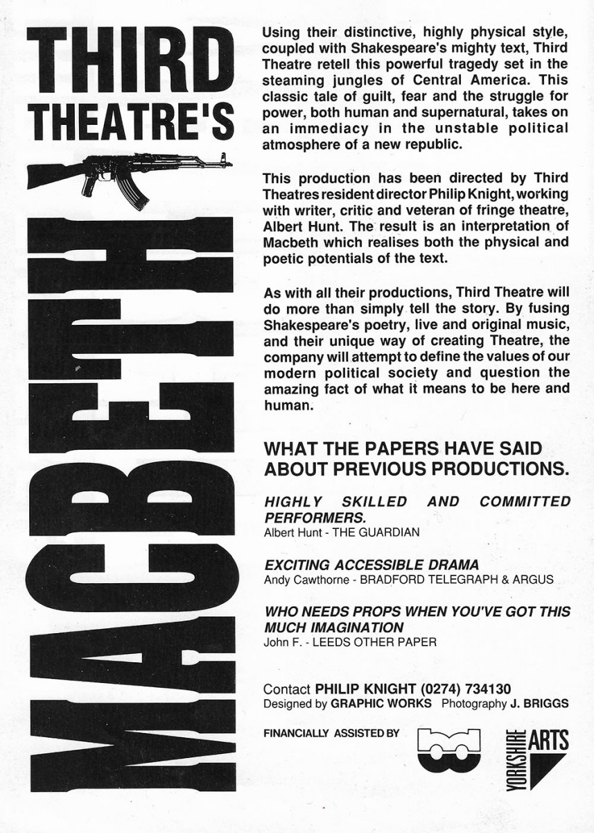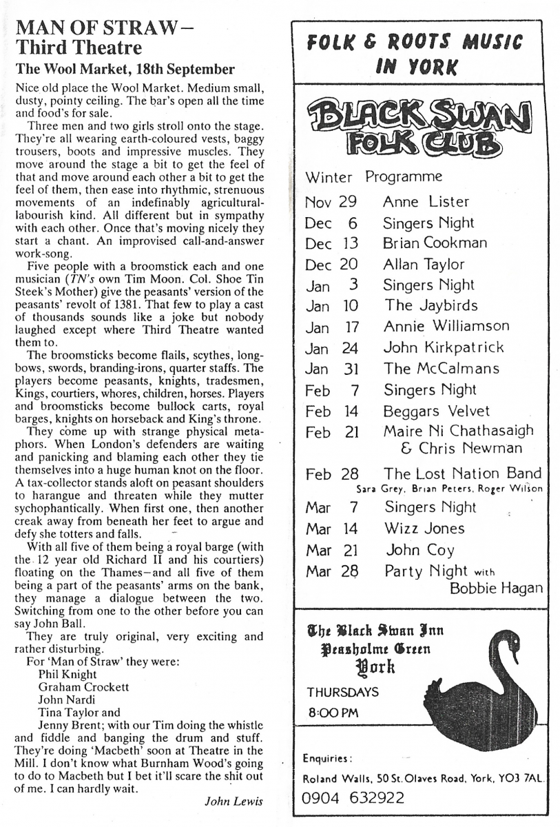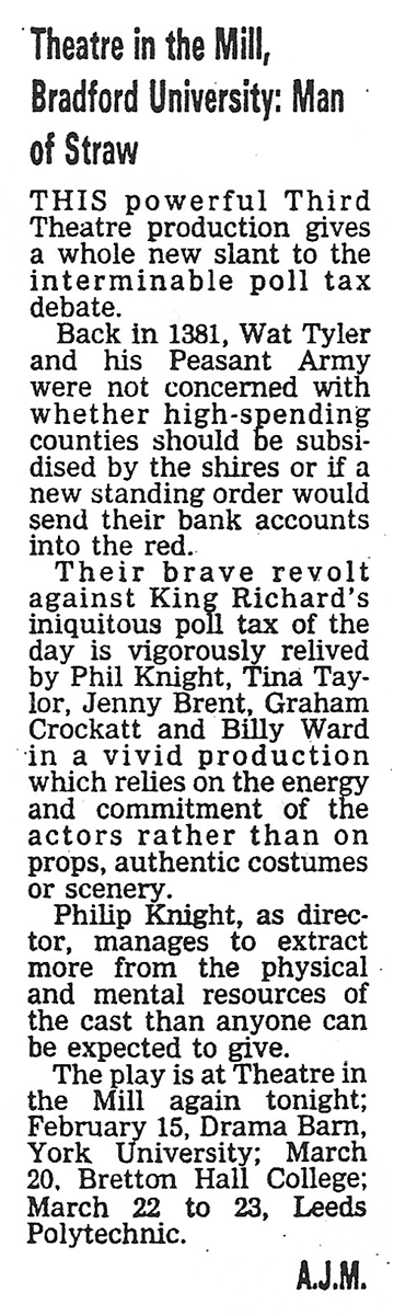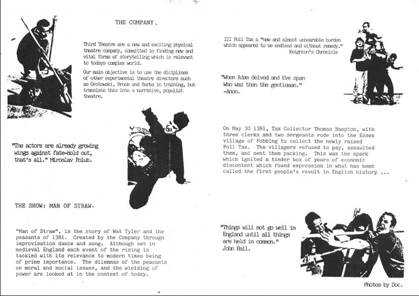 This was the first Third Theatre production and charts the rise and fall of the English Peasant’s Revolt of 1381. The project was instigated by Artistic Director, Philip Knight, and musician, Michael Gosling, to develop a company that trained physically and vocally to create devised productions. Continue reading “Man of Straw – The story of the 1381 Peasants Revolt”